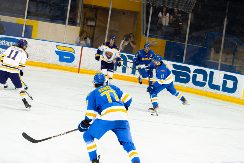 Minutes later, first-year Golden Hawks forward Luke Della Croce rushed towards the net on a breakaway. Edmonds committed to the save but Della Croce sent a cross-crease pass to second-year forward Kallaway Mercer, who banked the puck in the wide-open net.