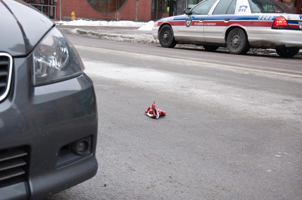 EyeBlogUncategorized Photo of the Day January 11, 2011 A Doritos chip bag is all that’s left on the road after a standoff between police and two men at Yonge and Gerrard this morning. Toronto Police received an emergency call at 6:50 a.m. about two men in a car with a possible firearm. For more on the story click here. Photo: Marta Iwanek